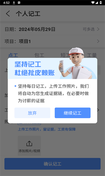工地记工,一款专注于建筑工程领域的专业记工记账软件。它涵盖记工记账、考勤管理、工资对账结算以及工作进度拍照等丰富多样的功能,不仅为工资计算与项目进度管理提供便捷,更助力提升工地管理水平。若您有相关需求,赶紧行动起来吧!