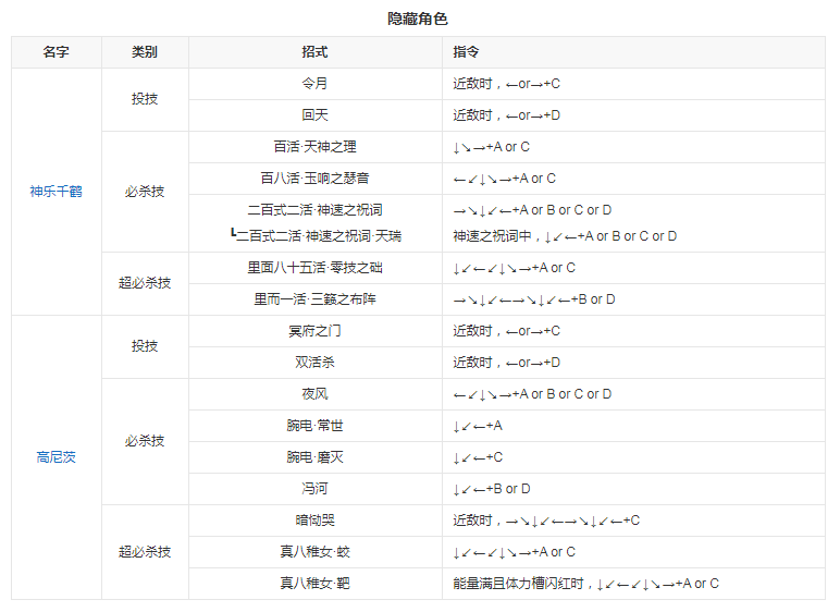 在角色选择界面,持续按住开始键,接着依次输入↑ + 轻脚键·→ + 重拳键·← + 轻拳键·↓ + 重脚键,操作成功后,便会出现神乐千鹤与高尼茨的选择框。